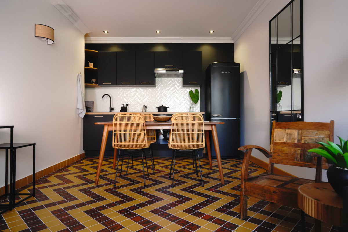 Priorité 3 – Aménager et meubler l’ensemble de l’appartement : L’objectif est d’organiser chaque espace pour un usage optimal, en privilégiant des matériaux et du mobilier résistants, tout en adoptant un style vintage et en conservant le carrelage d’époque dans la pièce à vivre, pour préserver le caractère et l’authenticité du lieu.